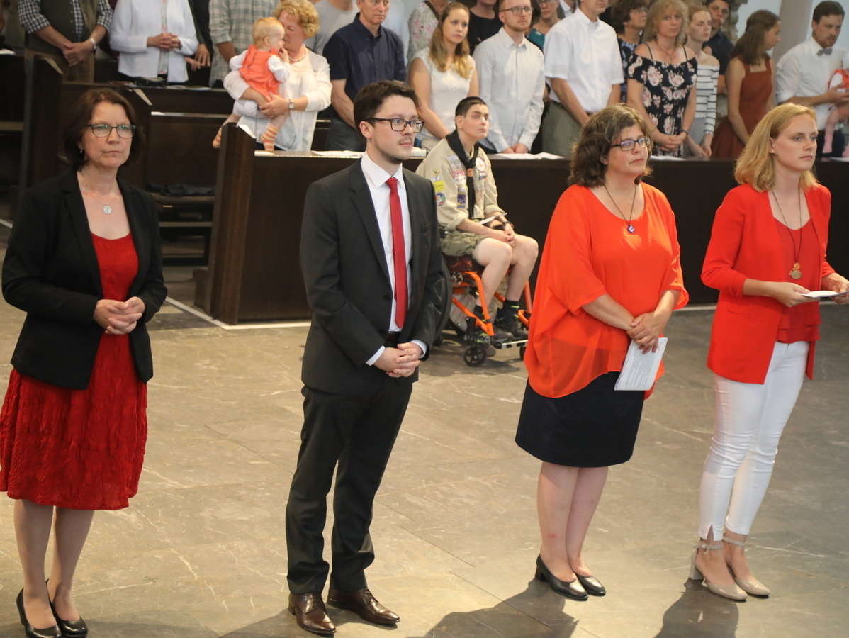 Bei einem feierlichen Gottesdienst im Kiliansdom hat am Freitagabend, 19. Juli, Weihbischof Ulrich Boom drei Frauen und einen Mann zum Dienst als Pastoral- und Gemeindereferenten beauftragt. Lisa Fischer (29), Christoph Hippe (31) und Claudia Nowak (46) begrüßte der Weihbischof als Pastoralreferentinnen und -referent. Regina Bühner (53) ernannte er zur Gemeindereferentin. Es konzelebrierten neben Generalvikar Thomas Keßler, Personalreferent Domkapitular Monsignore Dietrich Seidel und Domkapitular Dr. Helmut Gabel, Leiter der Hauptabteilung Außerschulische Bildung, Priester aus den aktuellen und künftigen Einsatzpfarreien der Beauftragten. Über 25 Ministranten und insgesamt etwa 350 Gläubige, unter anderem aus den jeweiligen Ausbildungs- und Heimatgemeinden der Beauftragten sowie Mitglieder der Berufsgruppen der Gemeinde- und Pastoralreferenten, feierten den Gottesdienst mit. Dieser stand unter dem Wort: „Siehe, ich bin mit dir, ich behüte dich, wohin du auch gehst!“ aus dem Buch Genesis.