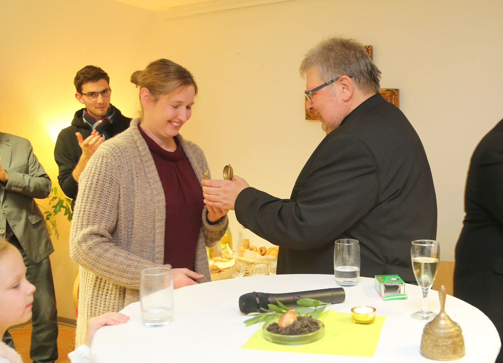 Auch die zukünftigen Pastoralreferenten hießen die neue Ausbildungsleiterin durch die musikalische Begleitung des Gottesdienstes und einen anschließenden Sektempfang willkommen. Zwei der Studenten überreichten ihr ein Geschenk mit den Worten: „Auch wir freuen uns auf die Zusammenarbeit mit Ihnen.“ Monsignore Seidel und Johannes Reuter, Diözesanreferent für die Berufsgruppe der Pastoralreferenten, übergaben Schoknecht symbolisch einen Kompass. „Er soll Dir bei der Suche helfen und Dir bei Deiner Arbeit mit den jungen Leuten eine Orientierung geben. Gott hat für jeden von uns einen Weg“, erklärte Reuter.