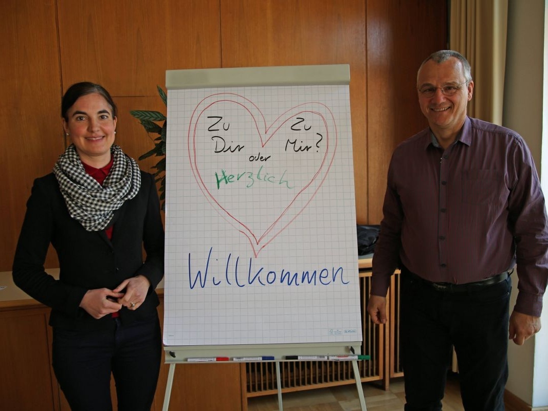 „Jetzt musst du um die linke untere Ecke vom Dreieck noch einen großen Kreis malen“, erklärt Katharina Pfeuffer (26) ihrem Partner Stefan Kafara (31). Rücken an Rücken sitzen sie im Rudolf-Alexander-Schröder-Haus in Würzburg und können nicht sehen, was jeweils der andere in den Händen hält. Katharina hat ein Blatt Papier, auf dem Linien, Kreise und Rechtecke aufgemalt sind. Ihre Aufgabe ist es, Stefan genau zu erklären, was sie sieht. Stefan muss die Formen auf sein weißes Blatt übertragen und darf dabei nicht spicken. „Kommunikation ist das Geheimnis jeder Partnerschaft“, sagt Frank Hofmann-Kasang und bittet die Paare nach dem Spiel wieder zurück in den Stuhlkreis. Er ist Pfarrer der evangelisch-lutherischen Kirchengemeinden Estenfeld und Kürnach und leitet zusammen mit Melanie Jörg-Kluger, Pastoralreferentin im Würzburger Stadtteil Sanderau und Diözesanrichterin am kirchlichen Gericht der Diözese Würzburg, das Seminar „Zu dir oder zu mir?“. Sechs Paare, von denen jeweils ein Partner katholisch, der andere evangelisch ist, bereiten sich auf ihre konfessionsverbindende Hochzeit vor.
