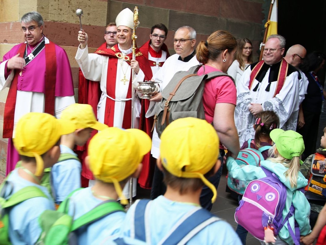 Die Feier endet mit dem gemeinsamen Vaterunser und dem Segenslied „Von oben, von unten“. Anschließend erteilen der Bischof und die anwesenden Priester und Diakone aus den Heimatgemeinden der Kinder den Kleinen einzeln den Segen. Viele Kinder und auch Erwachsene schauen sich den Schrein mit den Häuptern der Frankenapostel Kilian, Kolonat und Totnan ganz genau an. „Kilian, Kolonat und Totnan haben hier den Glauben verkündet“, hatte der Bischof zuvor erklärt. Studenten der Würzburger Fachakademie für Sozialpädagogik Sankt Hildegard begleiten die Statio wie auch die Prozession und die Wort-Gottes-Feier musikalisch.