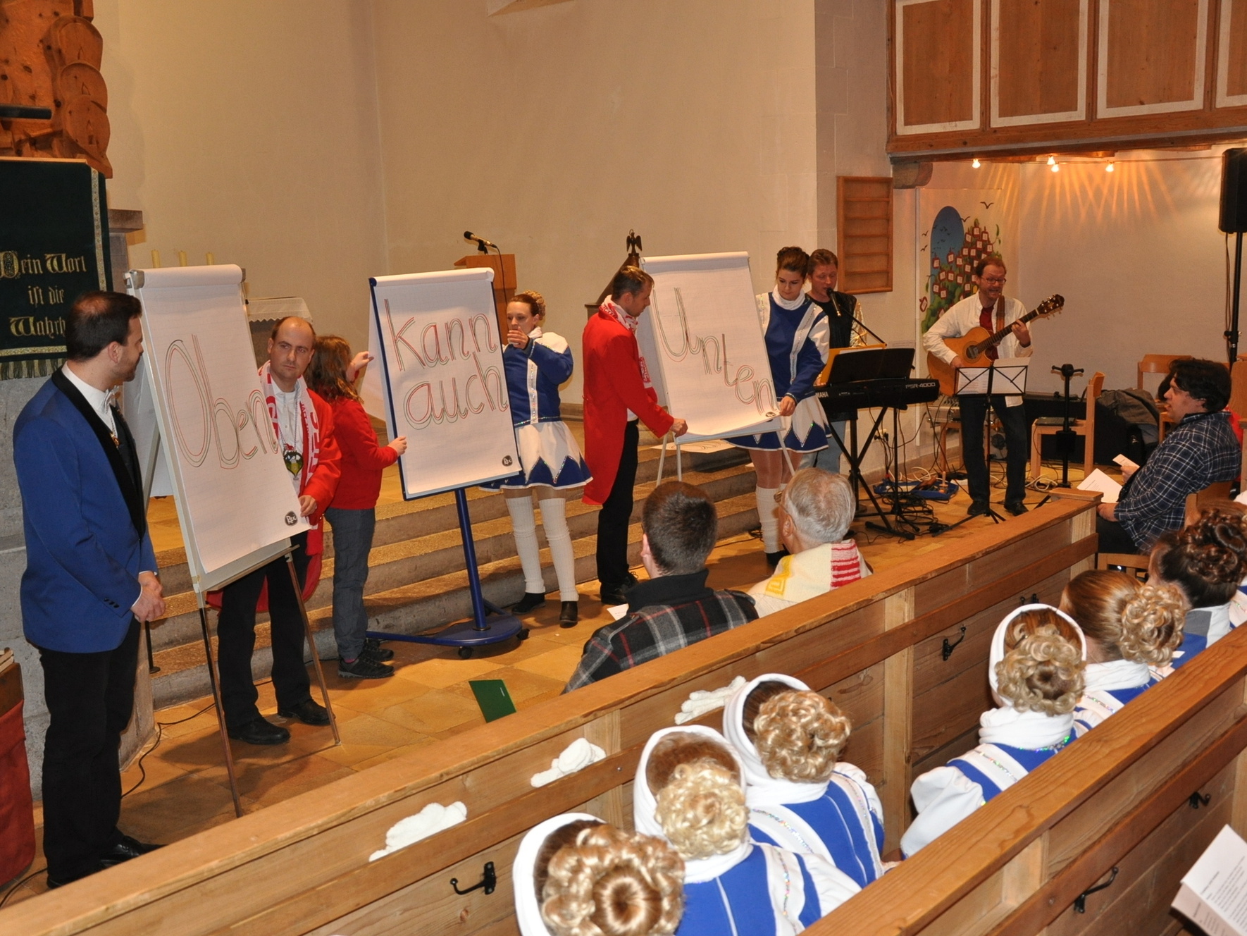 In diesem Jahr stand der Narrengottesdienst unter dem Motto „Hier bin ich Narr, darf ich hier sein?“. Diese Frage wurde schnell bejahend geklärt, denn auch die Kirche sei mit ganzem Herzen dabei, so Thorsten Kapperer. Die beiden gastgebenden Garden unterstrichen mit ihrer wortlosen „Bühnenshow“ am Altar, dass sie gerne alles auf den Kopf stellen. Diakon Christian Neeß fügte mit ausgesuchten Bibelstellen an, dass vor 2000 Jahren schon einmal ein Mensch gelebt hätte, der auch gerne so manches durch sein Tun auf den Kopf stellte. Es war Jesus.