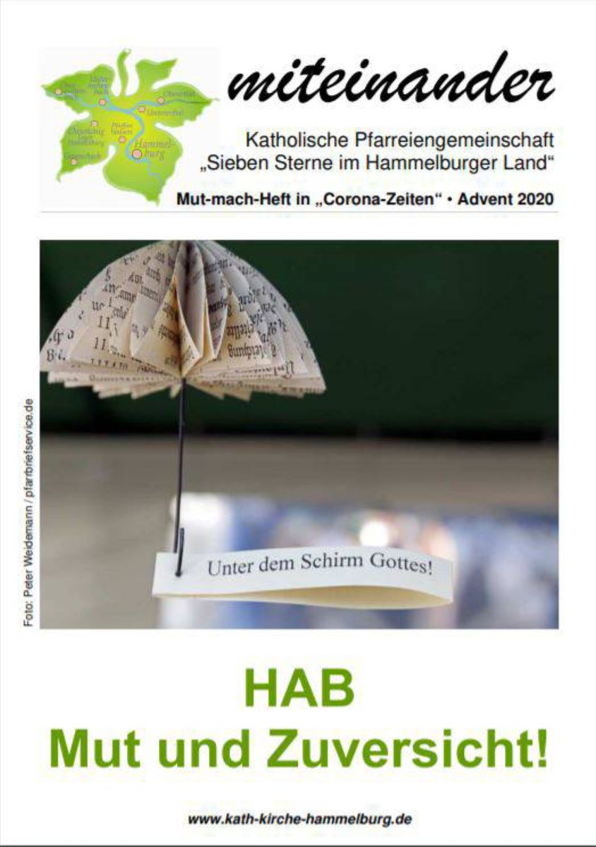 Statt ungewisse Veranstaltungen im regulären Pfarrbrief „miteinander“ anzukündigen, gestalteten Pastoralreferent Markus Waite und sein Team ein Heft, das der Pfarrgemeinde helfen solle, diese Wochen mit Corona und im Teil-Lockdown möglichst gut zu überstehen, sagt Waite. Unter dem Titel „Hab Mut und Zuversicht“ sind auf 32 Seiten Impulse, Gedichte, Gebete, Rätsel und Hilfestellungen zu finden, die von unterschiedlichen Menschen gestaltet wurden. Die Harfenspielerinnen Edeltraud Milner und Bianca Volker stellen zum Beispiel ihre Aktion „Licht sein für andere“ vor. In diesem Rahmen bieten sie ein individuelles Vorspiel für alle Senioren und Alleinstehenden an. Unter der Überschrift „Was hilft in Corona“ gibt Pfarrer Thomas Eschenbacher konkrete Tipps für diese Zeit, und beim „Rätsel gegen den Corona-Blues“ von Diakon Manfred Müller wird unter den Teilnehmern dreimal sein signiertes Adventsbuch „Komm, lass uns leben“ verlost. Das Heft erscheint einmalig für die Pfarreiengemeinschaft und wird an die katholischen Haushalte verteilt. Im Internet ist es frei verfügbar unter https://www.kath-kirche-hammelburg.de/aktuelles/download?folder=Pfarreiengemeinschaft%2B-%2BGottesdienstordnungen.