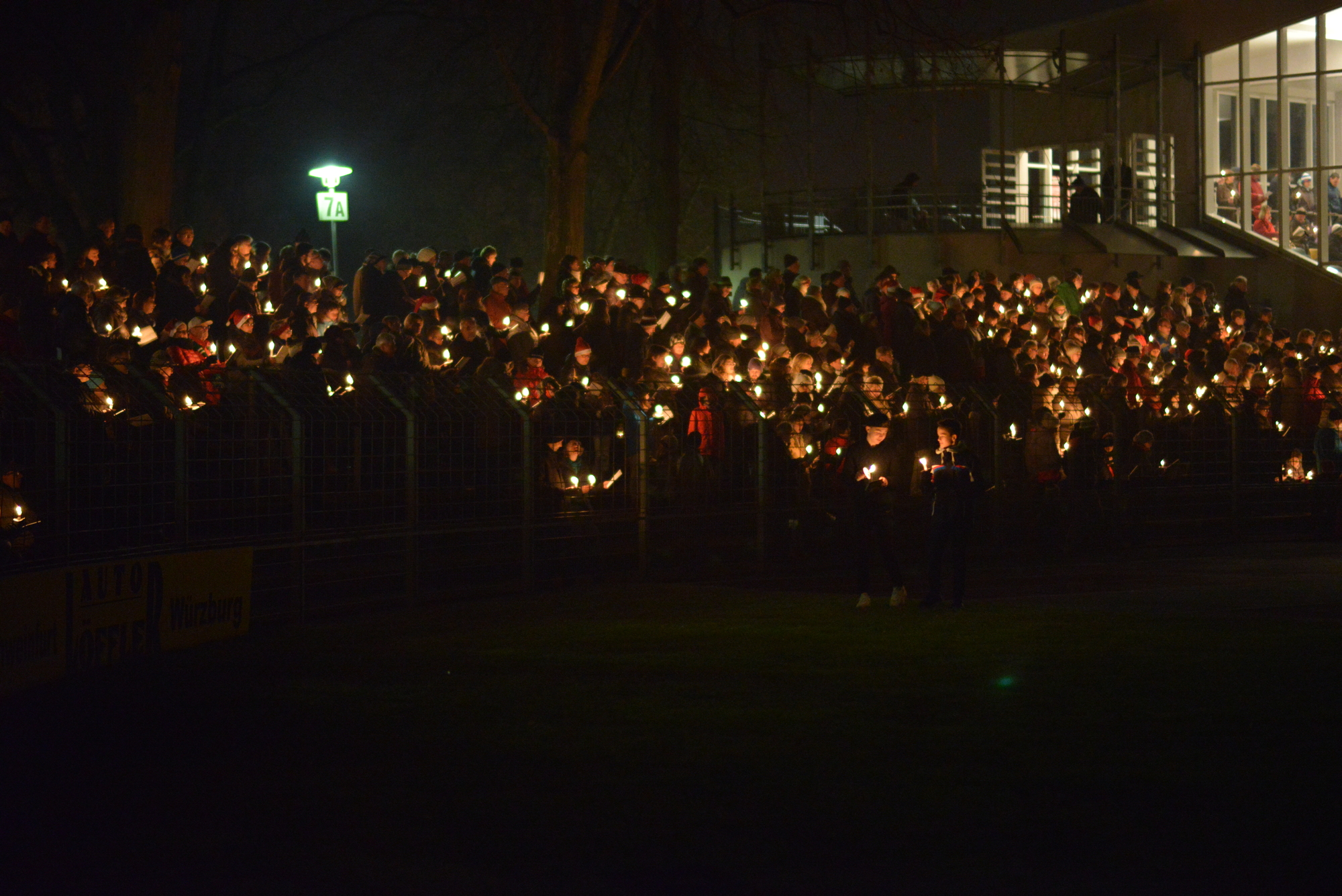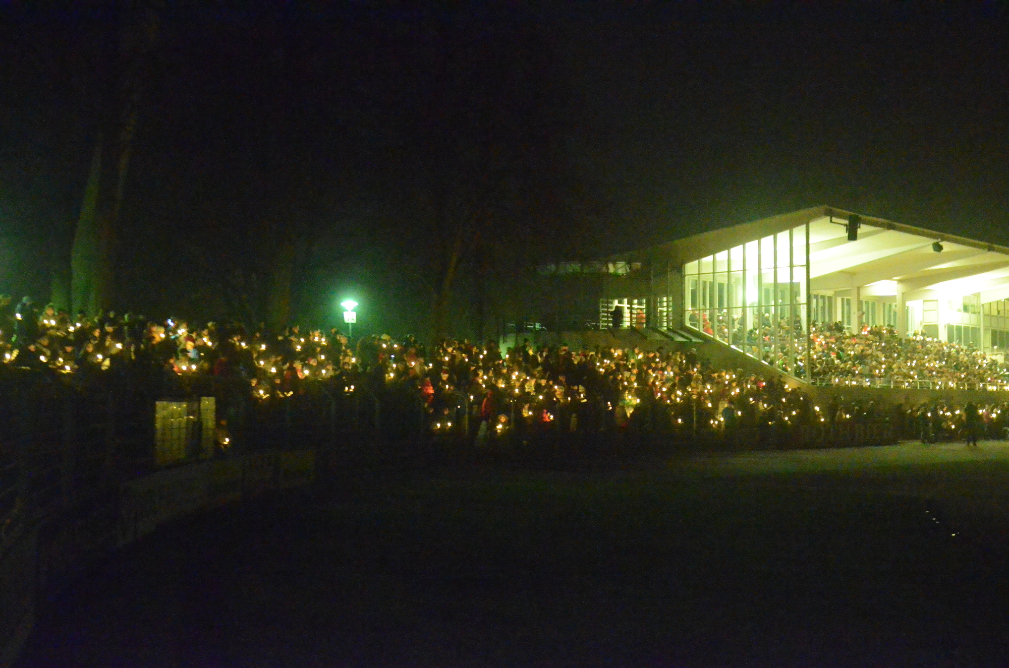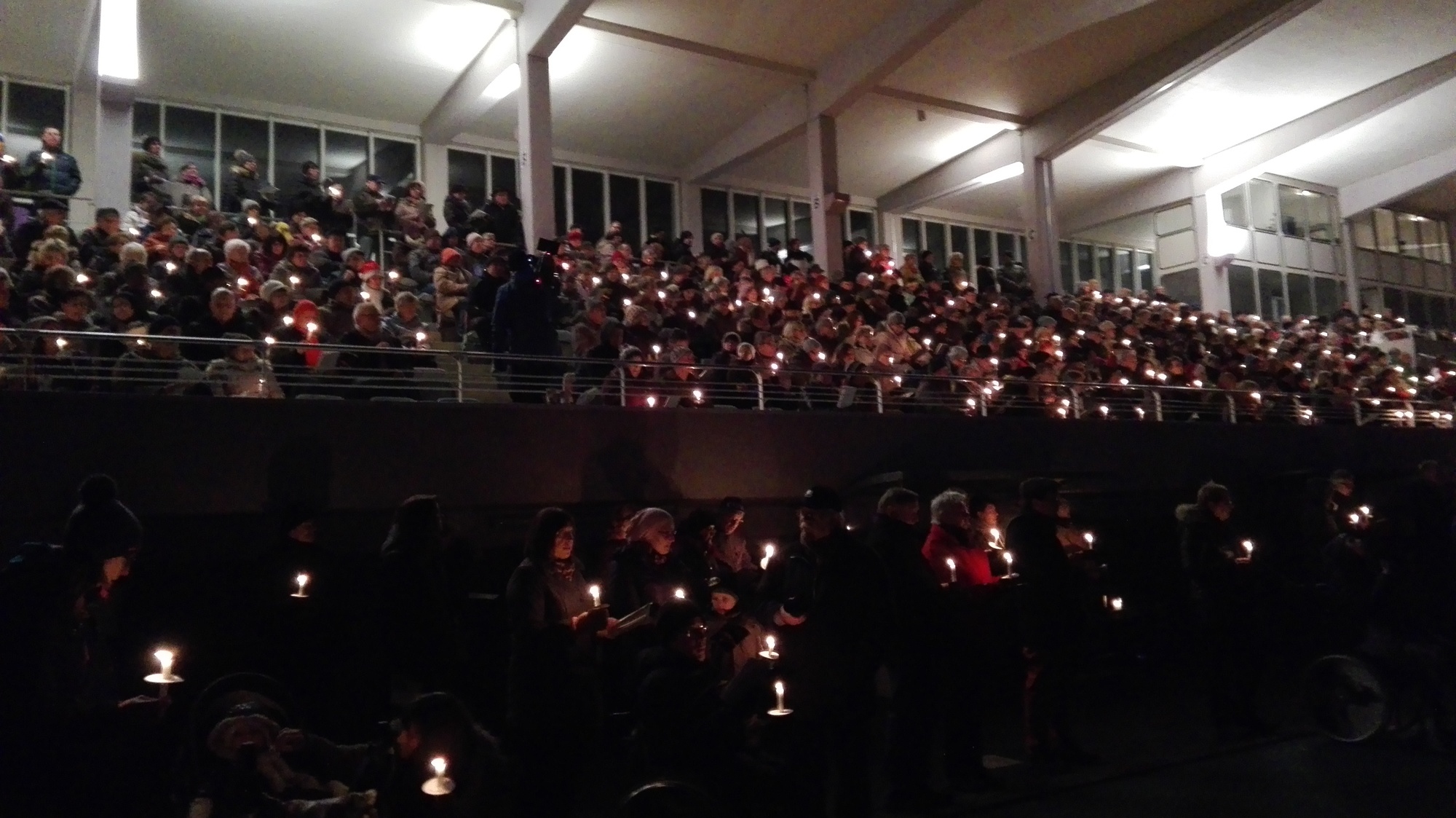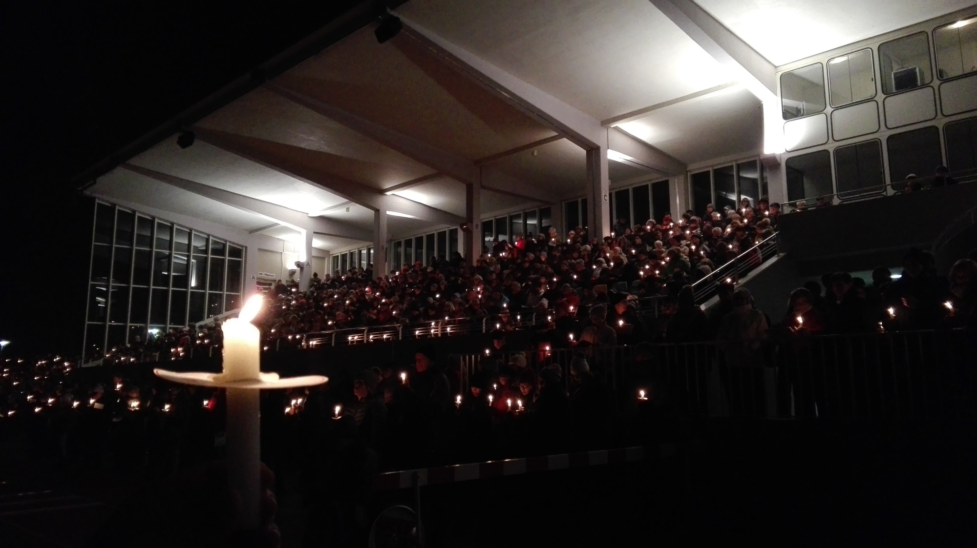 Ein toller Auftakt des ersten Weihnachtsliedersingens im Stadion: Gute Stimmung, ein friedliches Miteinander und ein Kerzenmeer über die Tribüne und die angrenzenden Ränge sorgten für Gänsehautstimmung - an einem Ort, wo sonst "die Schnüdel" (Fußballer des FC 05)l ihre Heimspiele austragen. Die Botschaft des Friedenslichtes aus Betlehem, von dessen Flamme die Kerzen der Beteiligten angezündet wurden, kam an. Schon während des ersten Liedes mit " Leise rieselt der Schnee" (der aber leider nicht rieselte), wurde auch deutlich: eine solche Veranstaltung hat Zukunft. Sie bewegt etwas. Wenn sich so viele auf den Weg machen: Chöre, Musiker, Singbegeisterte, Artisten, dann entsteht ein gemeinschaftliches Erlebnis für alle und jeden. Der gemeinsame Einsatz aller, der katholischen Citypastoral wie evangelischen Citykirche, aber auch der Jugendkirche kross und der Mithilfe des FC 05 bei der Bewirtung der Leute hat sich gelohnt. Ich sage nur: Danke und hoffentlich auf ein Neues im nächsten Jahr!